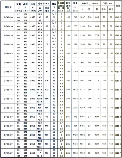 DF型泵供輸送溫度為-20~105℃,不含固體顆粒、有腐蝕性的液體。泵的進口壓力小于0.6MPa。DF型泵是臥式、單吸、多級多段式離心泵,泵的出口入口均垂直向上,用拉緊螺栓將泵的吸入段、中段、吐出段聯(lián)結(jié)成一體,泵轉(zhuǎn)子由裝在軸子的葉輪、平衡盤等零件組成。轉(zhuǎn)子兩端由滾動軸承或滑動軸承支撐,滾動軸承用油脂潤滑,轉(zhuǎn)子軸向力由平衡盤平衡。